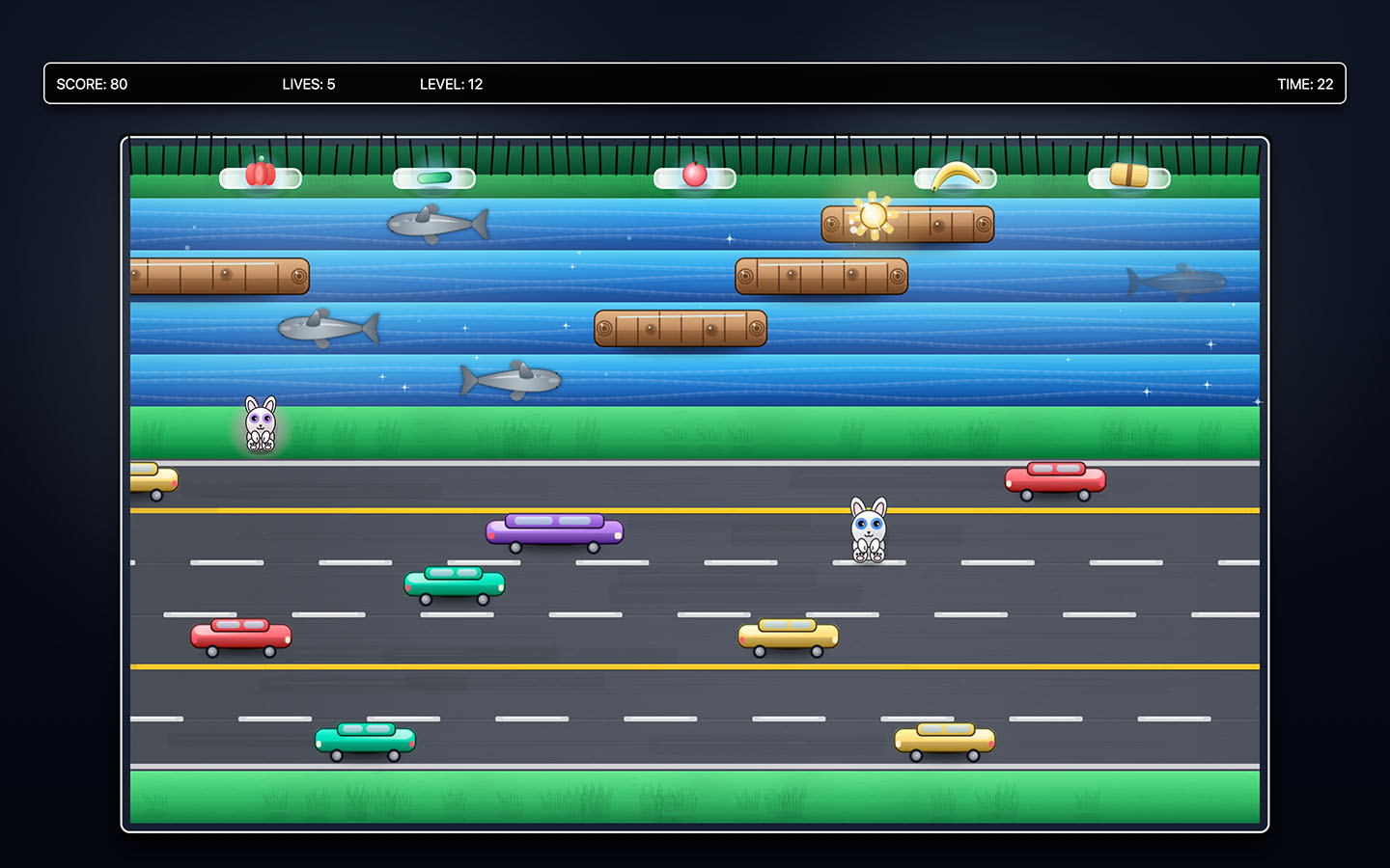 Hop lane by lane through speeding traffic, then cross unpredictable water by timing your moves across floating logs and surfacing dolphins. Every level remixes patterns, speeds, and spacing—play smart, play fast, and keep your run alive.